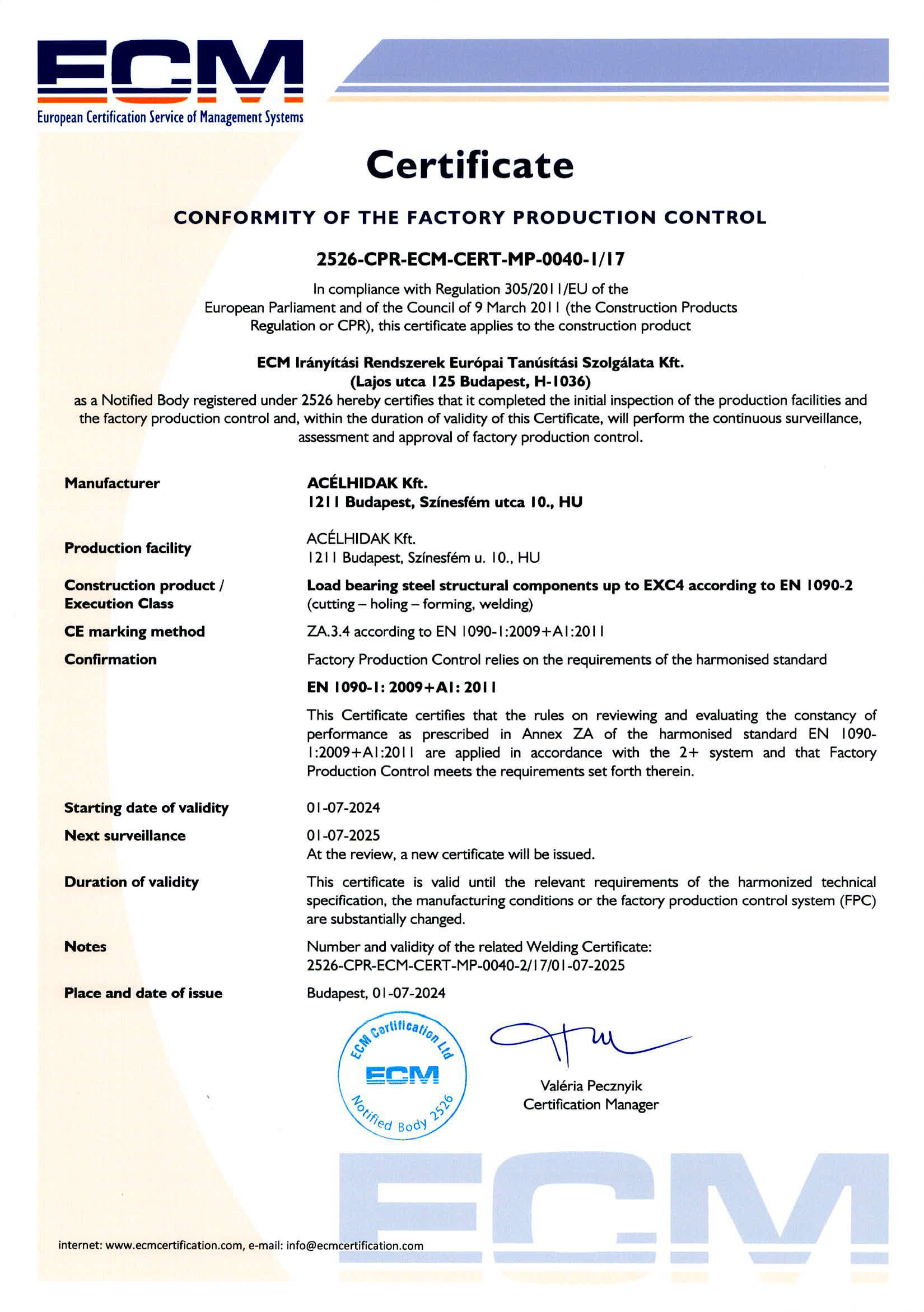 ACÉLHIDAK is a Hungarian company with manufacturing and construction of steel structures – mainly bridges and cranes – in the focus of its activity. We are happy to provide our clients with the related engineering services as well. Every single custom-made steel structure we produce is high-quality and indvidual, tailored to our clients' needs. Our fabrication hall is suitable to manufacture steel structures up to 30m x 4m x 3 m or / 32t.