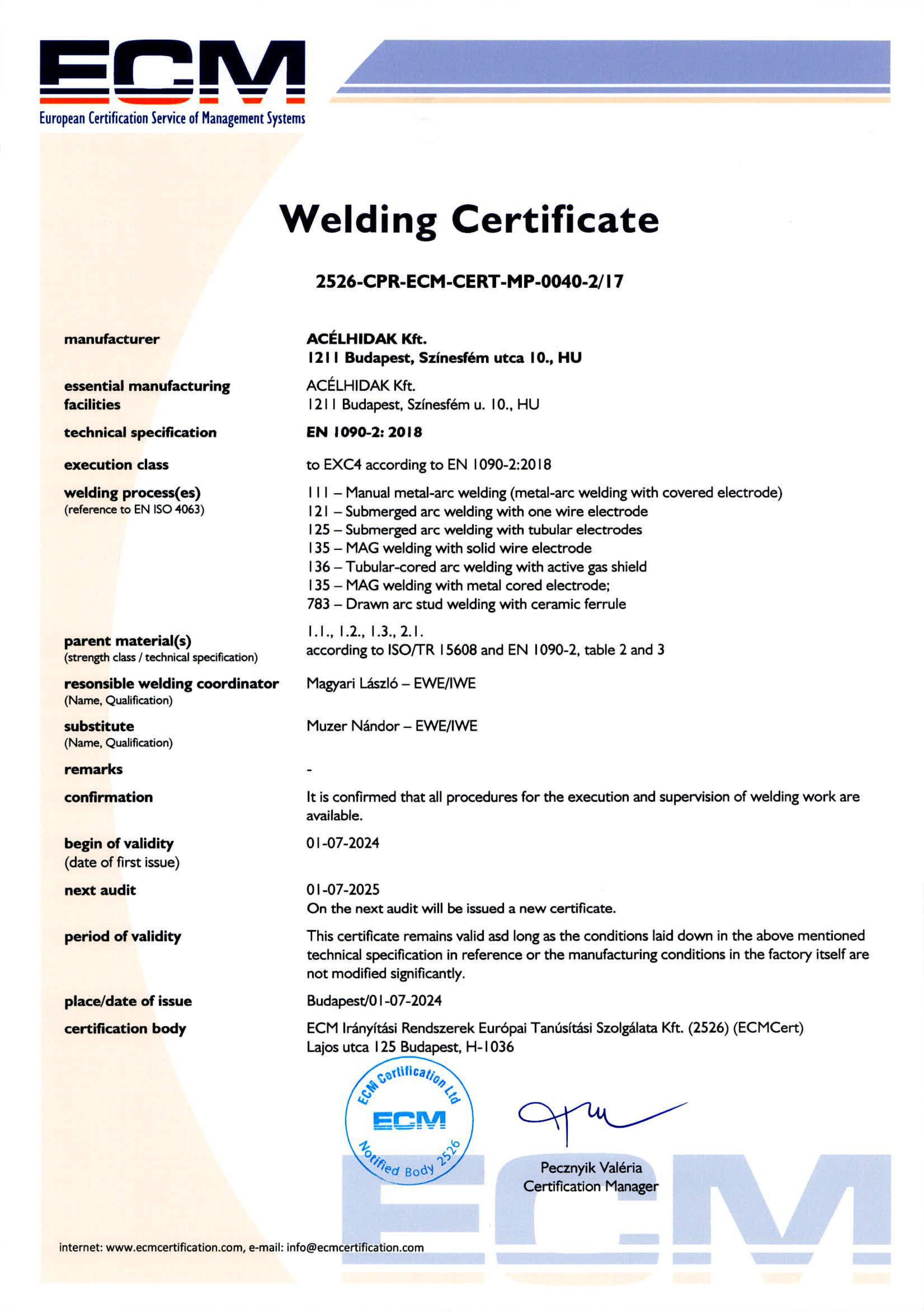 ACÉLHIDAK is a Hungarian company with manufacturing and construction of steel structures – mainly bridges and cranes – in the focus of its activity. We are happy to provide our clients with the related engineering services as well. Every single custom-made steel structure we produce is high-quality and indvidual, tailored to our clients' needs. Our fabrication hall is suitable to manufacture steel structures up to 30m x 4m x 3 m or / 32t.